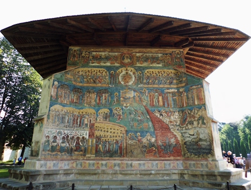 Spettacolari affreschi risalenti al 1547, coprono le pareti esterne Affresco famoso è quello del GIUDIZIO UNIVERSALE che si rova sulla facciata occidentale.